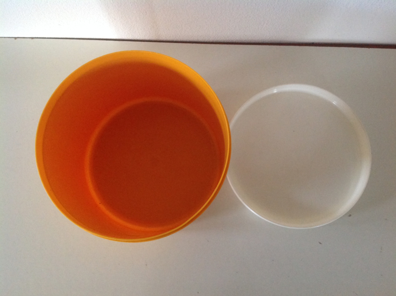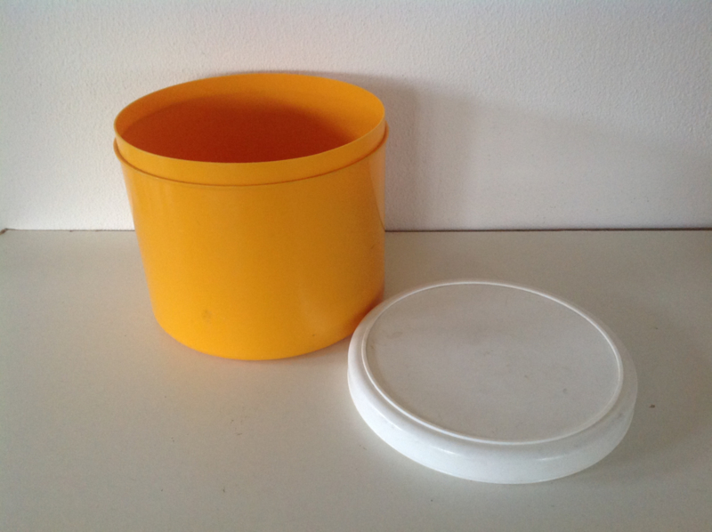 Voorraadbus. Okergeel. Plastic.